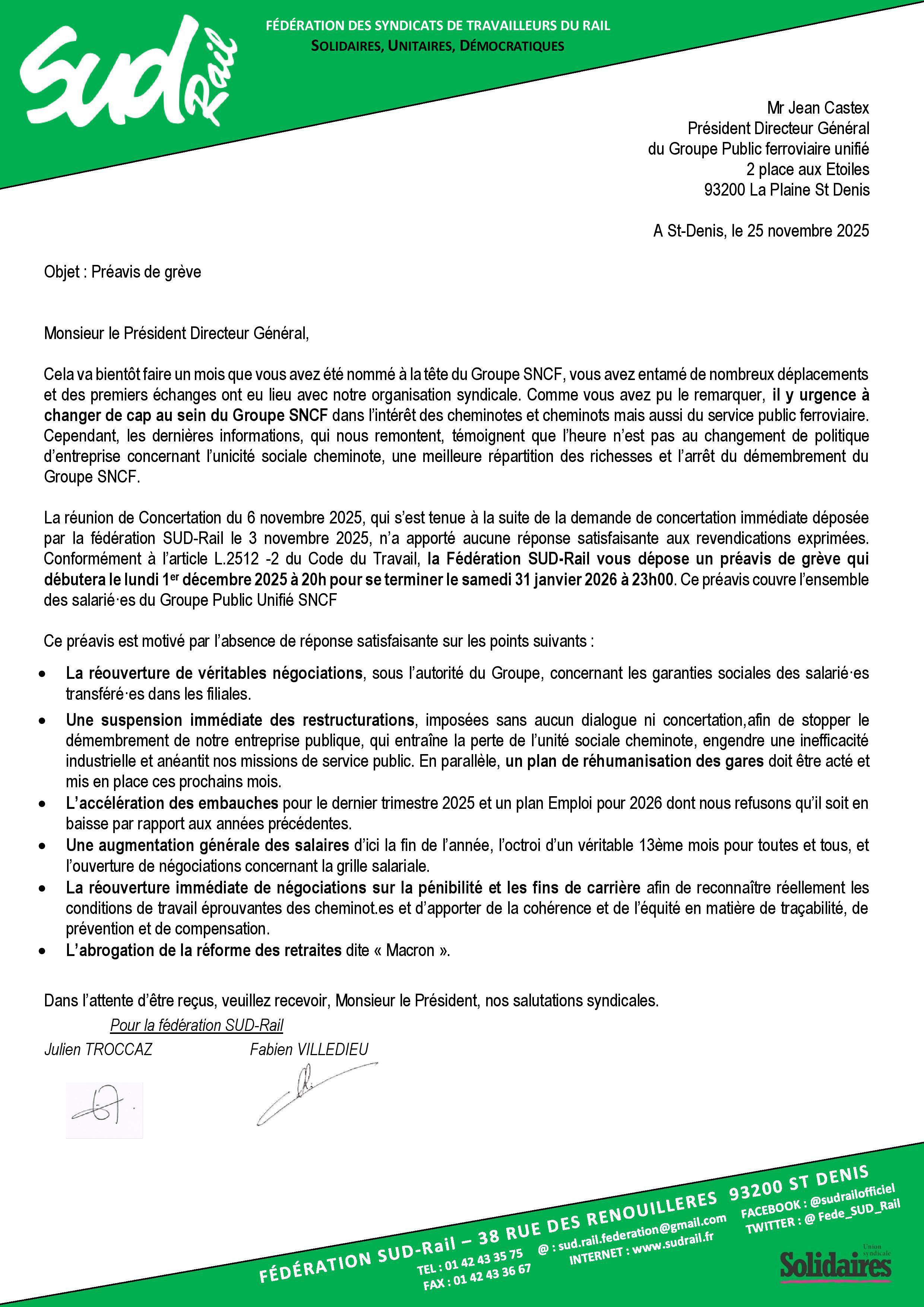 La réunion de Concertation du 6 novembre 2025, qui s’est tenue à la suite de la demande de concertation immédiate déposée par la fédération SUD-Rail le 3 novembre 2025, n’a apporté aucune réponse satisfaisante aux revendications exprimées. Conformément à l’article L.2512 -2 du Code du Travail, vous trouverez en pièce-jointe un préavis de grève déposé par la fédération SUD-Rail qui débutera le lundi 1er décembre 2025 à 20h pour se terminer le samedi 31 janvier 2026 à 23h00. Ce préavis couvre l’ensemble des salarié·es du Groupe Public Unifié SNCF.