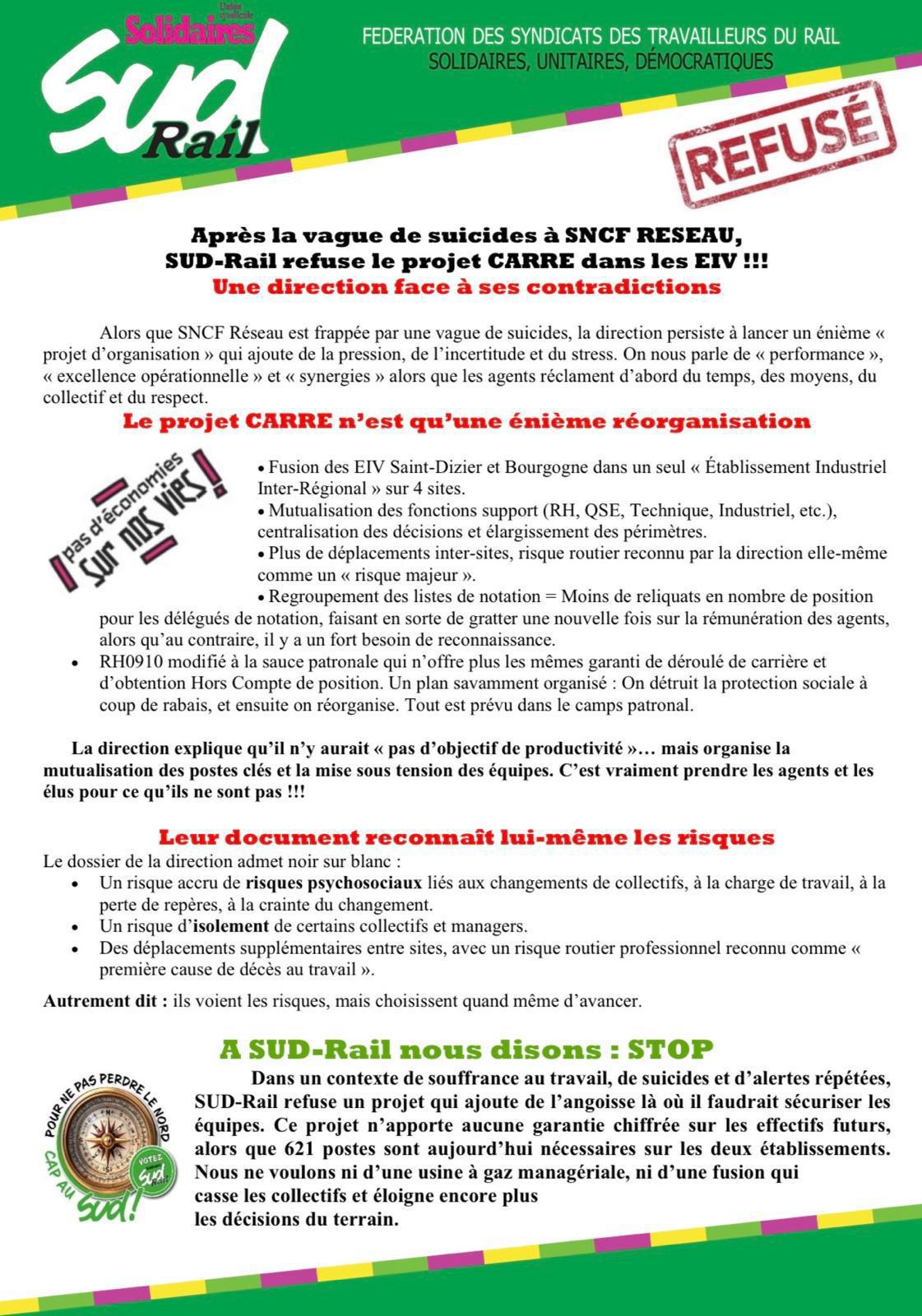 Dans un contexte de souffrance au travail, de suicides et d’alertes répétées, SUD-Rail refuse un projet qui ajoute de l’angoisse là où il faudrait sécuriser les équipes. Ce projet n’apporte aucune garantie chiffrée sur les effectifs futurs, alors que 621 postes sont aujourd’hui nécessaires sur les deux établissements. Nous ne voulons ni d’une usine à gaz managériale, ni d’une fusion qui casse les collectifs et éloigne encore plus les décisions du terrain