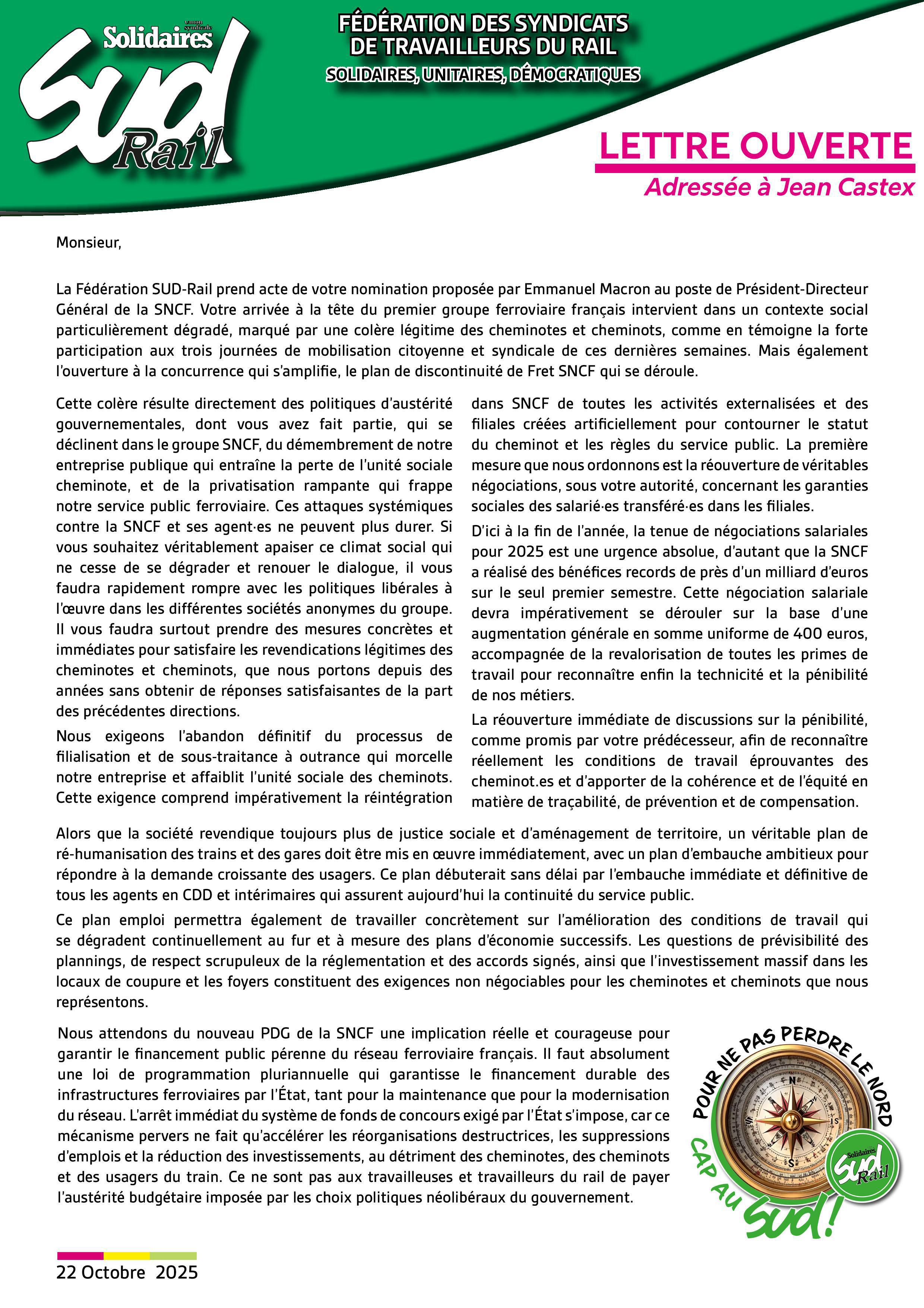 La Fédération SUD-Rail prend acte de votre nomination proposée par Emmanuel Macron au poste de Président-Directeur Général de la SNCF. Votre arrivée à la tête du premier groupe ferroviaire français intervient dans un contexte social particulièrement dégradé, marqué par une colère légitime des cheminotes et cheminots, comme en témoigne la forte participation aux trois journées de mobilisation citoyenne et syndicale de ces dernières semaines. Mais également l’ouverture à la concurrence qui s’amplifie, le plan de discontinuité de Fret SNCF qui se déroule.
