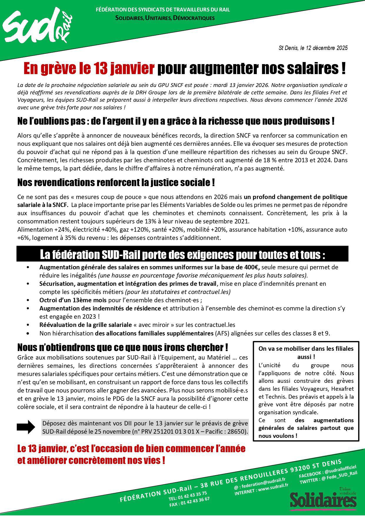 La date de la prochaine négociation salariale au sein du GPU SNCF est posée : mardi 13 janvier 2026. Notre organisation syndicale a déjà réaffirmé ses revendications auprès de la DRH Groupe lors de la première bilatérale de cette semaine. Dans les filiales Fret et Voyageurs, les équipes SUD-Rail se préparent aussi à interpeller leurs directions respectives. Nous devons commencer l’année 2026 avec une grève très forte pour nos salaires !